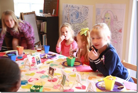 Our only real game was Pictionary. I had a few ideas on paper, or they could come up with their own secret to draw. Because most of the kids are in the same class at school, it was hilarious to hear them speak in first grade terms- one girl drew a “Landscape” for everyone to guess. At another point in the party everyone was discussing “statements” vs. “questions” and “exclamations.” First graders are so sophisticated these days!